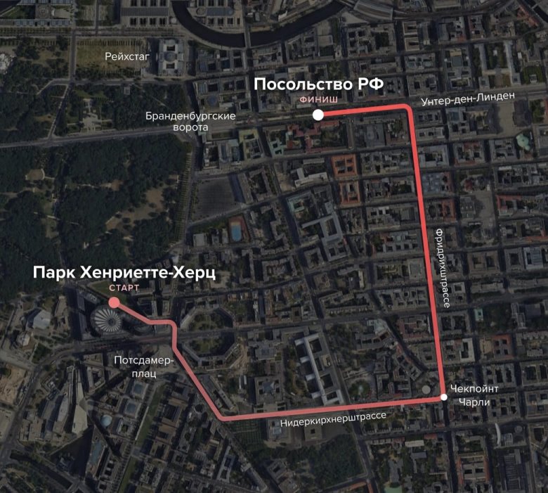 Etiraz yürüşü Niderkirhnerştrassedən başlayacaq, Çekpoynt Çarli məntəqəsi qarşısından keçməklə, Fridrixştrassedən Unter den Linden 63-65 ünvanına qədər davam edəcək. Etiraz aksiyasının həmin ünvanda yerləşən Rusiya Federasiyası səfirliyinin binası önündə davam etdiriləcəyi bildirilir.