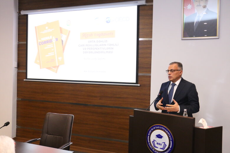 Açılış nitqi ilə çıxış edən BSU-nun rektoru Anar Nağıyev Ümummilli Lider Heydər Əliyevin siyasi kursunun layiqli davamçısı, Azərbaycan Respublikasının Prezidenti cənab İlham Əliyevin rəhbərliyi altında qəhrəman şəhidlərimizin igidliyi sayəsində əldə olunan Zəfərin 5 illiyi münasibətilə tədbir iştirakçılarını təbrik edib. O, Zəfərin əldə edilməsindən sonrakı dövrdə ölkəmizin siyasi-iqtisadi sahədə qazandığı nailiyyətlərdən danışıb, Azərbaycanın qlobal arenada yeni reallıqlar yaratdığını, artıq dünyada söz sahibi olan ölkəyə çevrildiyini diqqətə çatdırıb. Rektor “Orta Dəhliz: Cari reallıqların təhlili və perspektivlərin dəyərləndirilməsi” adlı kitabın əhəmiyyətindən bəhs edərək, nəqliyyat-tranzit imkanlarının genişləndirilməsinin müasir dövr üçün əhəmiyyətini vurğulayıb.