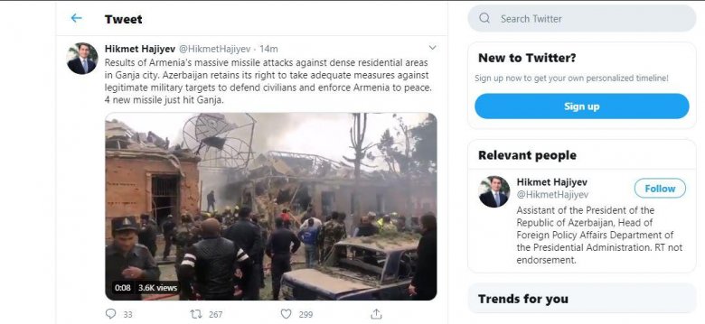 “Azərbaycan mülki şəxsləri müdafiə etmək və Ermənistanı sülhə məcbur etmək üçün legitim hərbi hədəflərə qarşı tədbirlər görmək hüququnu saxlayır. 4 yeni raket Gəncəyə düşüb”.