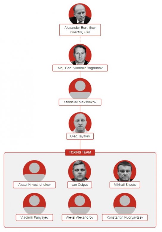 Jurnalistlərin verdiyi məlumata görə, qrupa bir zamanlar Rusiyadakı Dövlət Orqanik Sintezlər Texologiyaları İnstitutunda kimyəvi silahların yeni növlərini hazırlamaqla məşğul olmuş Stanislav Makşakov başçılıq edib. Oleq Tayakin (“Tarasov”) qrupda ikinci adam olub, bir növ Makşakovun müavini funksiyasını yerinə yetirib.