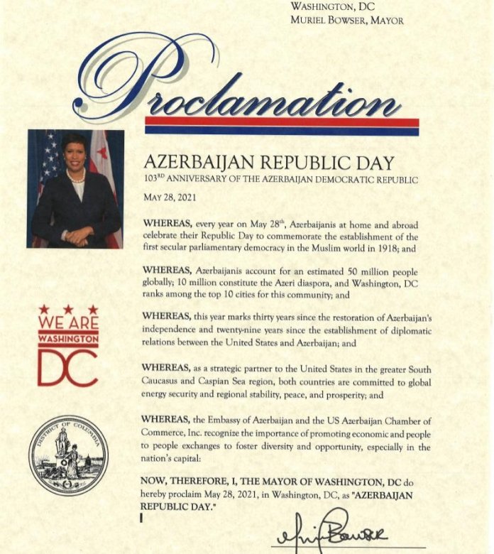 ABŞ-ın paytaxtı Vaşinqton şəhərinin meri Myuriel Bauzer Azərbaycan Demokratik Respublikasının yaranmasının 103-cü ildönümü ilə bağlı 28 May tarixini Respublika Günü elan edib və bununla bağlı bəyannamə imzalayıb.