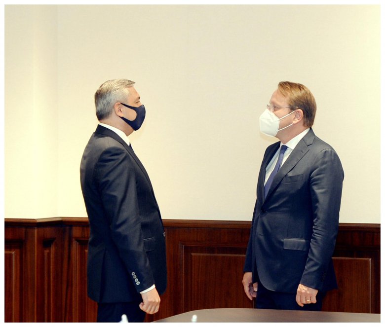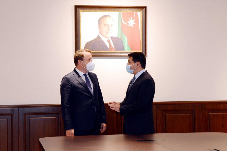 Avropa İttifaqının (Aİ) qonşuluq və genişlənmə üzrə komissarı Oliver Varhelyi Azərbaycana səfəri çərçivəsində Azərbaycanın Prezident Administrasiyasının rəhbəri Samir Nuriyev və Azərbaycan Prezidentinin köməkçisi, Prezident Administrasiyası xarici siyasət məsələləri şöbəsinin müdiri Hikmət Hacıyevlə görüşüb.
