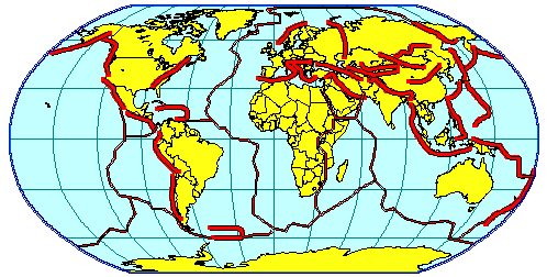Şəkil 1. Yer kürəsinin seysmik xəritəsi. (Seysmik zonalar qırmızı xətlərlə göstərilib. Azərbaycan da güclü seysmik zonadadır)