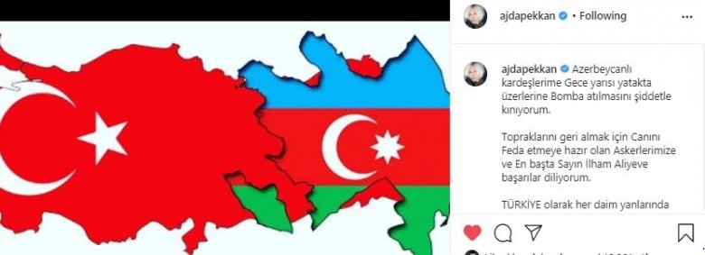 Reyting.az xəbər verir ki, sənətçi İnstaqram səhifəsində Azərbaycan və Türkiyə bayraqlarının fotosunu yayımlayıb. Pekkan işğalçı Ermənistanın mülki əhalini atəşə tutmasını qınayıb: