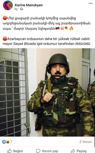 Reyting.az-ın məlumatına görə, Karine Manukyan adlı şəxs Səyyad Əlizadənin fotosunu paylaşaraq yazıb ki, Azərbaycan Ordusunun daha bir yüksək rütbəli zabiti, mayor Səyyad Əlizadə Ermənistan hərbçiləri tərəfindən öldürülüb.