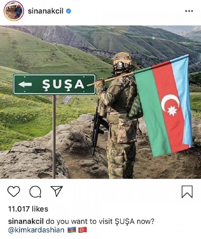Sinan paylaşımına erməni əsilli realiti-şou ulduzu Kim Kardaşyanı işarələyib. İfaçının paylaşımına qısa zamanda minlərlə bəyəni və şərh gəlib.