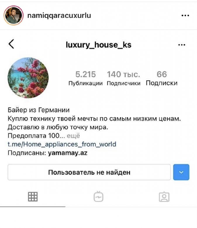 ”Sizdən bir xahişim var: bu, səhifə guya mal sifarişi ilə məşğuldur. Əslində isə işi dələduzluqdur. Mal sifariş verirsən, pul kartına oturur və adam yoxa çıxır. Azərbaycanda bu səhifənin qurbanı olan, içi mən qarışıq çox insan var. Başqalarının da zərər görməməsi üçün birləşib bu səhifəni şikayət edib bağlatdırmaq lazımdır. Ümid edirəm ki, bu dələduzun dərsini verə biləcəyik”.(Axşam.az)