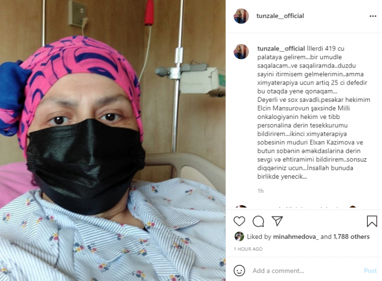 Tünzalə Əliyeva yazıb: “İllərdi 419-cu palataya gəlirəm. Bir ümidim var ki, sağalacam və sağalıram da. Gəlmələrimin sayını itirmişəm. Amma kimyaterapiya üçün artıq 25-ci dəfədir bu otaqda yenə qonağam. İnşallah, bunu da birlikdə yenəcəyik”.