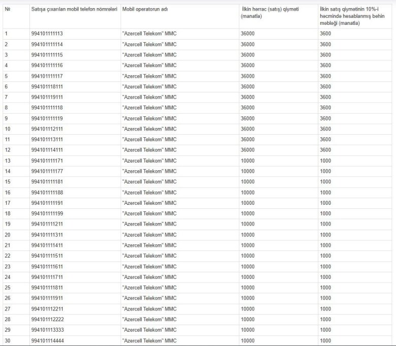 Əmlak Məsələləri Dövlət Xidməti "Azercell Telekom" MMC-yə məxsus mobil telefon nömrələrini açıq hərraca çıxarıb.